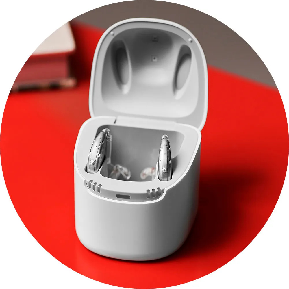 西嘉首款无触点式充电的充电盒,只需将助听器放入盒中,即可开始充电。